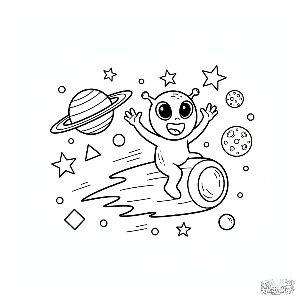 Página para colorear del espacio para niños de 4-6 años: un alienígena amigable monta un cometa pasando un planeta anillado. Escena cósmica divertida y simple.