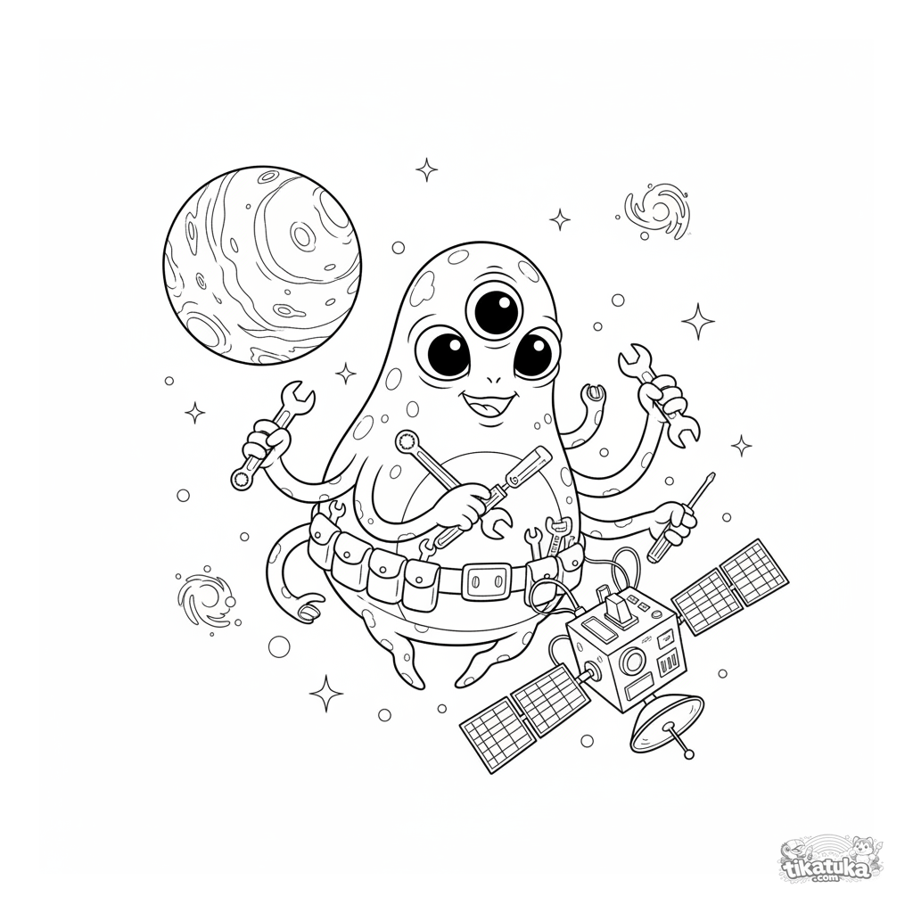Página para colorear espacial realista y detallada para niños mayores de 7-12 años: un alienígena con tentáculos repara un satélite. Escena compleja con planetas de fondo.