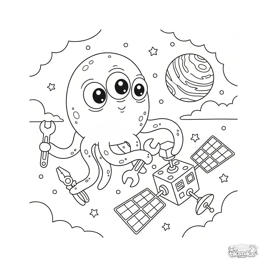 Página para colorear para niños mayores 7-12 años: un alienígena amigable con tentáculos repara un satélite en el espacio exterior.