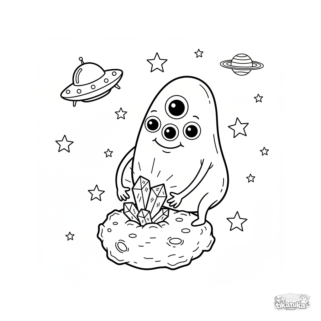 Página para colorear temática espacial para niños 4-6: un alienígena lindo de varios ojos recolecta cristales brillantes en un asteroide. Fondo estrellado simple.