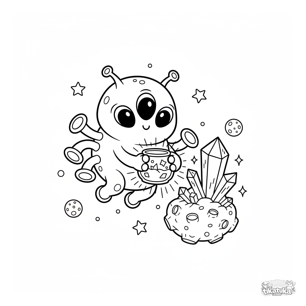 Página para colorear para niños de 4-6 años con tema espacial: un alienígena amigable recolecta cristales brillantes en un asteroide. Una escena fantástica para colorear.