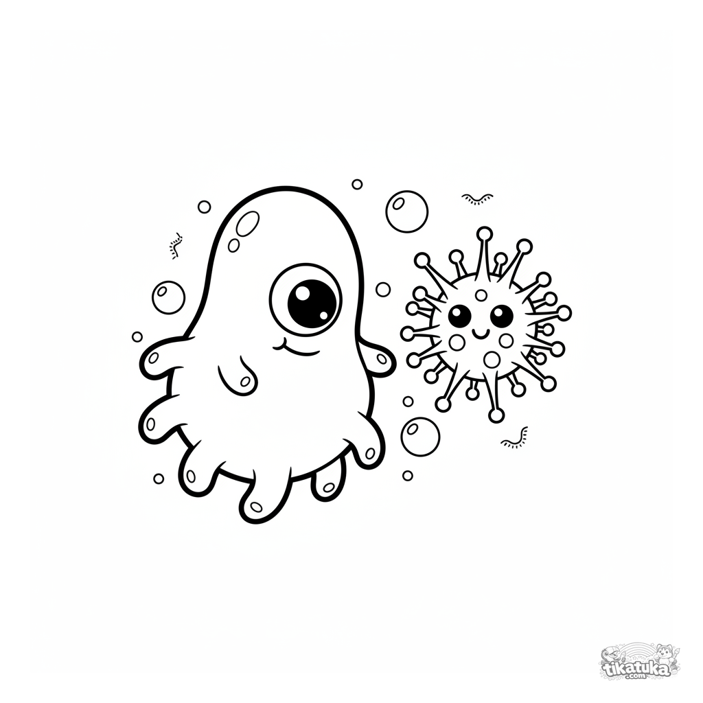 Página para colorear para niños: una ameba microbio amigable flotando cerca de un virus de dibujos animados. Para 4-6 años.