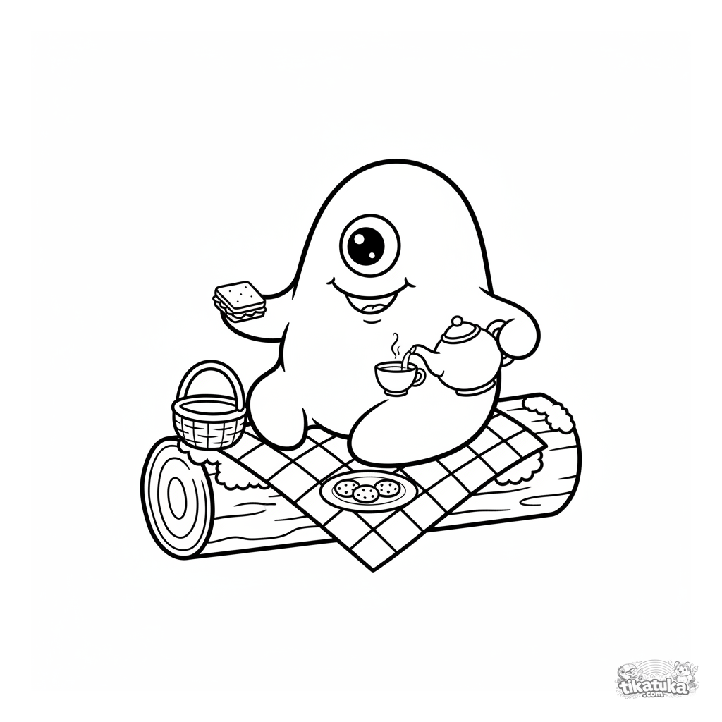 Página para colorear simple y linda para niños pequeños: un microbio ameba amigable hace un picnic en un tronco musgoso. Grandes detalles, contornos gruesos.