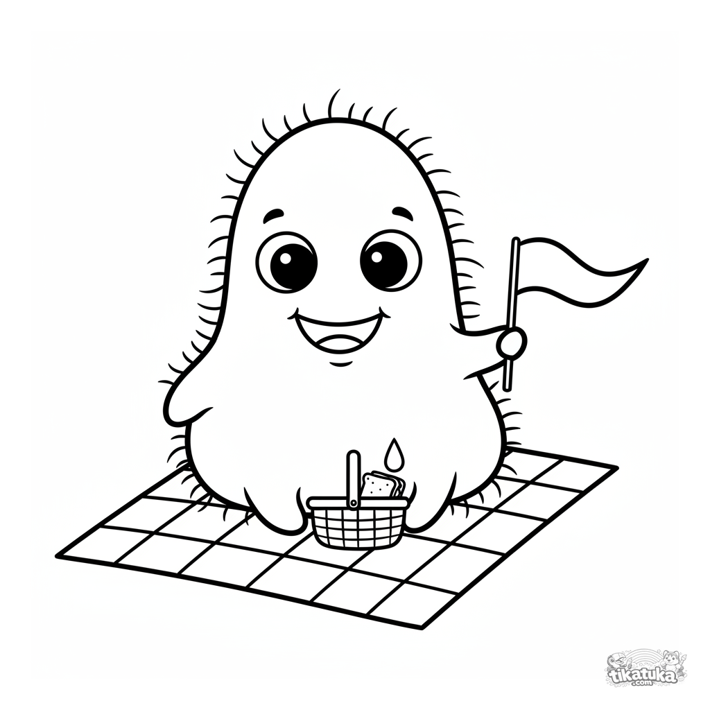Página para colorear para niños pequeños de 2-3 años: una linda y simple ameba microbio sentada en un picnic. Formas enormes y simples, perfecto para primeros crayones.