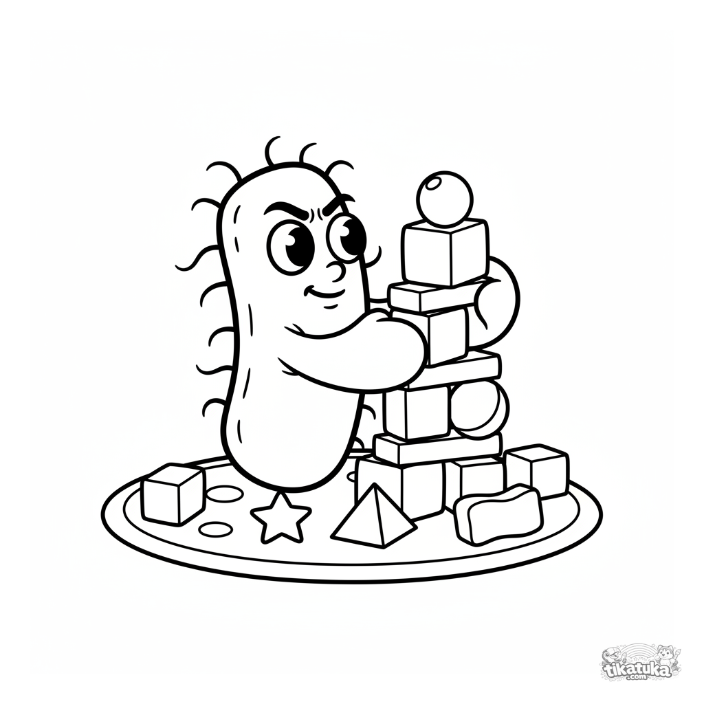 Página para colorear fácil y linda para niños de 2 a 5 años: una bacteria amigable en forma de bastón construye una torre con bloques pegajosos. Formas grandes.