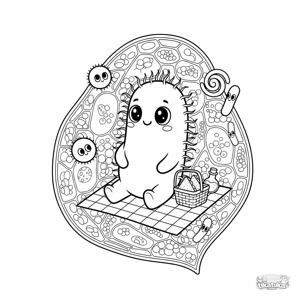 Página para colorear de un bacilo amigable haciendo un picnic en una célula de hoja. Para niños de 6 a 9 años.