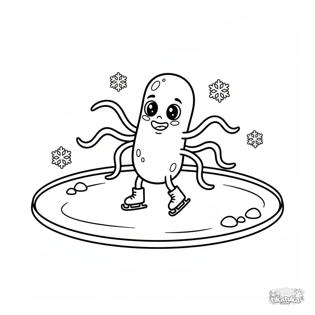 Página simple para colorear de una bacteria amistosa patinando sobre hielo. Para niños pequeños de 2 a 5 años.