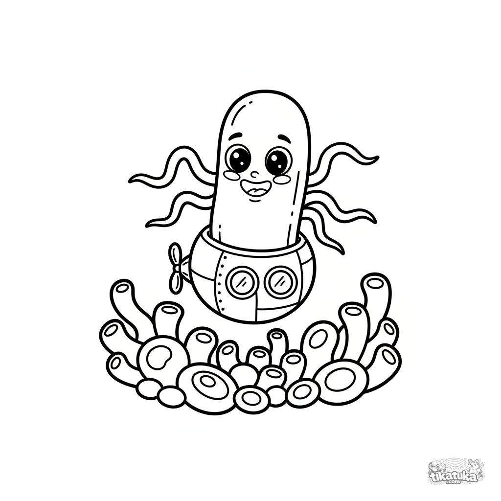 Página simple para colorear para niños pequeños de 2-3 años con una bacteria amigable en un submarino. Formas grandes, pocos detalles, márgenes amplios.