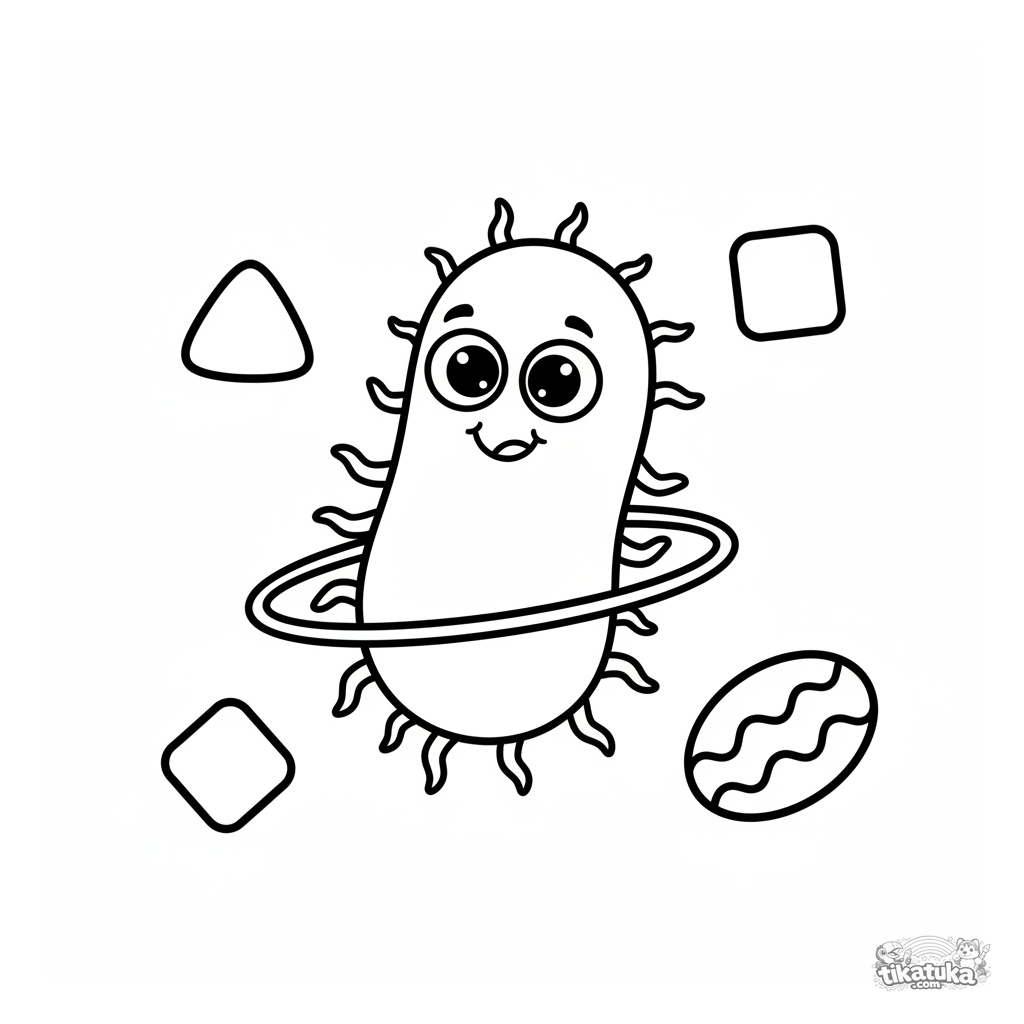 Página para colorear muy simple para niños pequeños de 2-3 años: una bacteria amigable gira un aro de hula. Formas grandes, contornos gruesos.