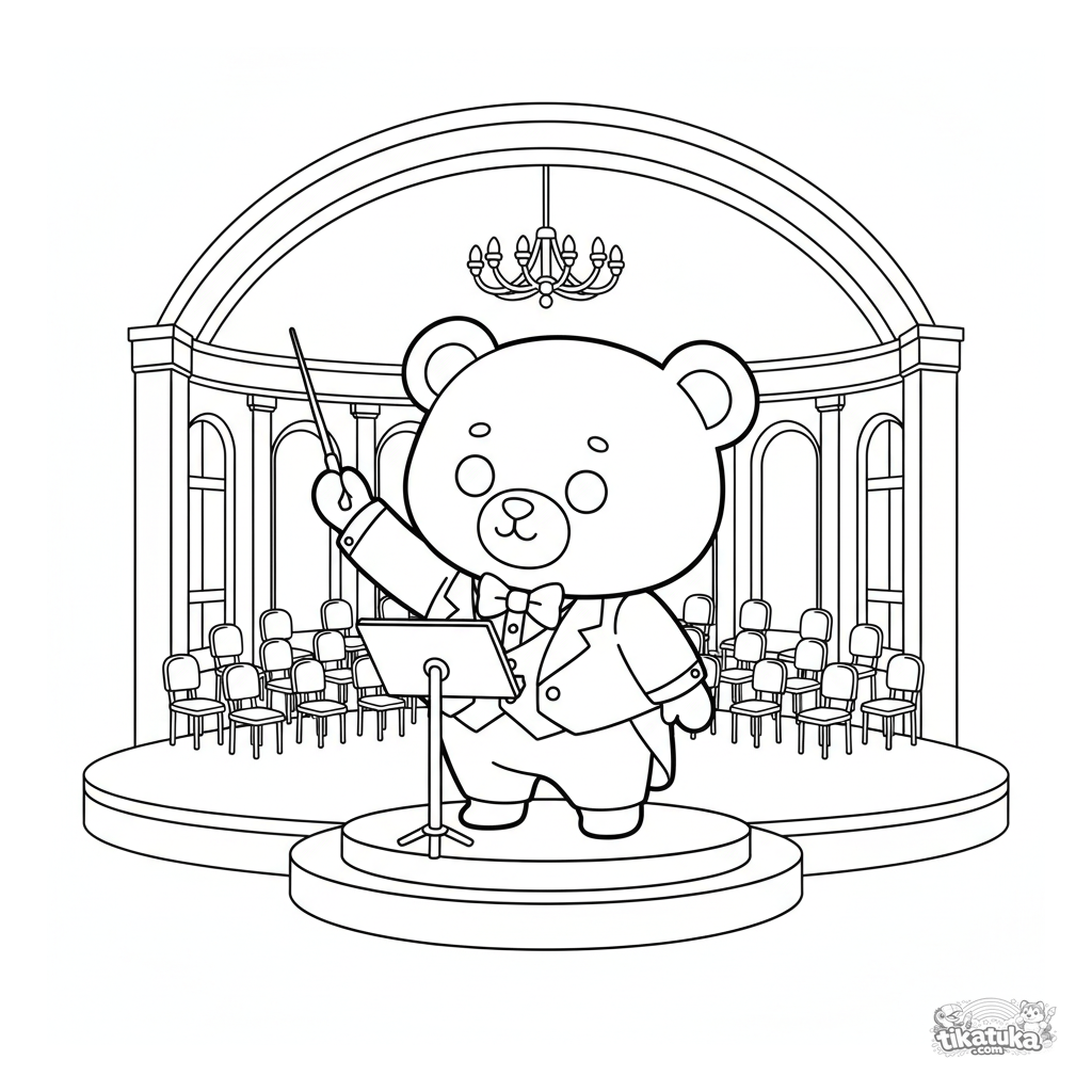 Página para colorear para niños de 4 a 6 años: un oso de peluche con frac dirige una orquesta en el gran escenario de una sala de conciertos.