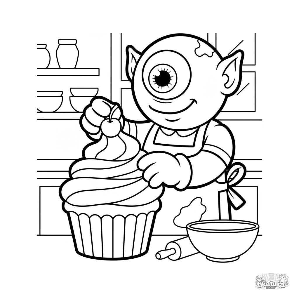 Página para colorear para niños pequeños 2-3 años: un cíclope panadero amigable decora un cupcake gigante. Formas grandes y simples, sin fondo.