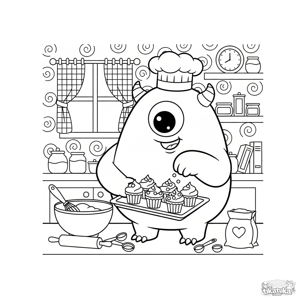 Página para colorear para niños de 4-6 años: un cíclope amistoso con gorro de chef horneando cupcakes en una cocina acogedora. Escena simple y linda.