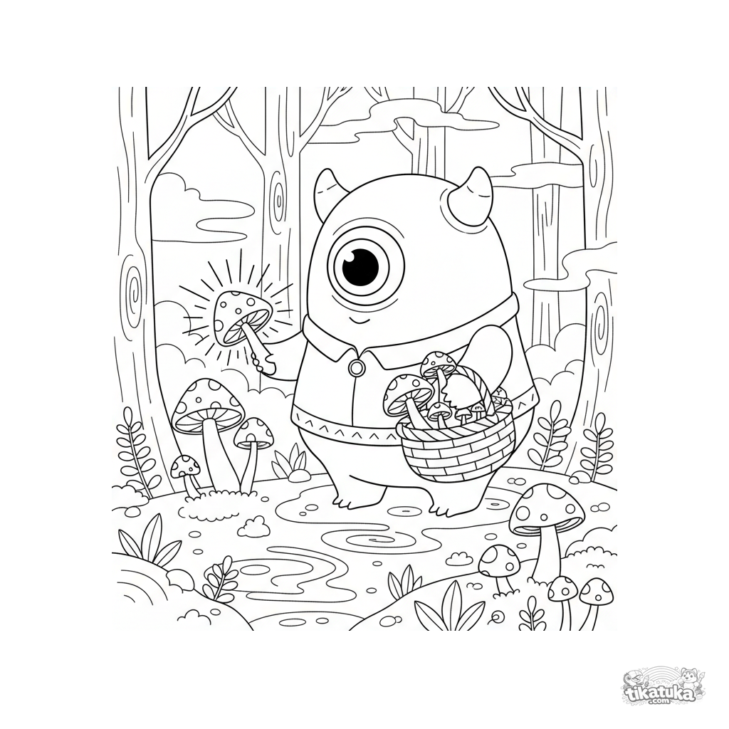 Página para colorear de un cíclope amigable en el bosque. Para niños de 4 a 6 años. El monstruo tierno recoge setas brillantes en un claro del bosque mágico.