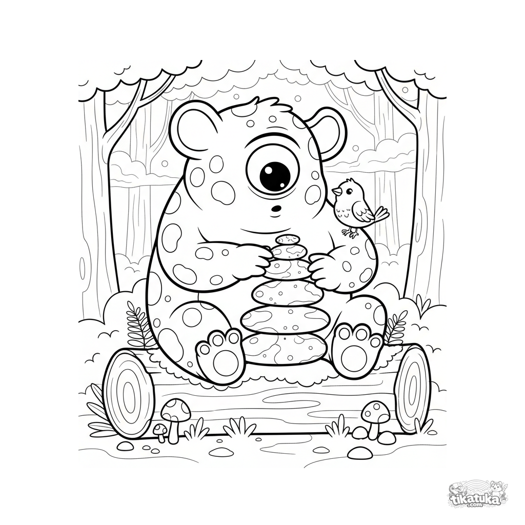 Página para colorear de un cíclope amigable con pelo manchado en un bosque. Para niños de 4 a 6 años. El monstruo apila piedras en un tronco.
