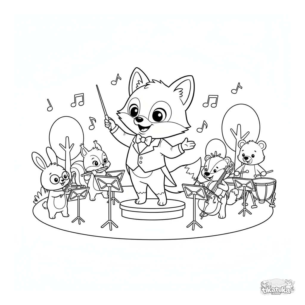 Página para colorear para niños 4-6: un zorro director de orquesta dirige una mini orquesta de animales músicos.