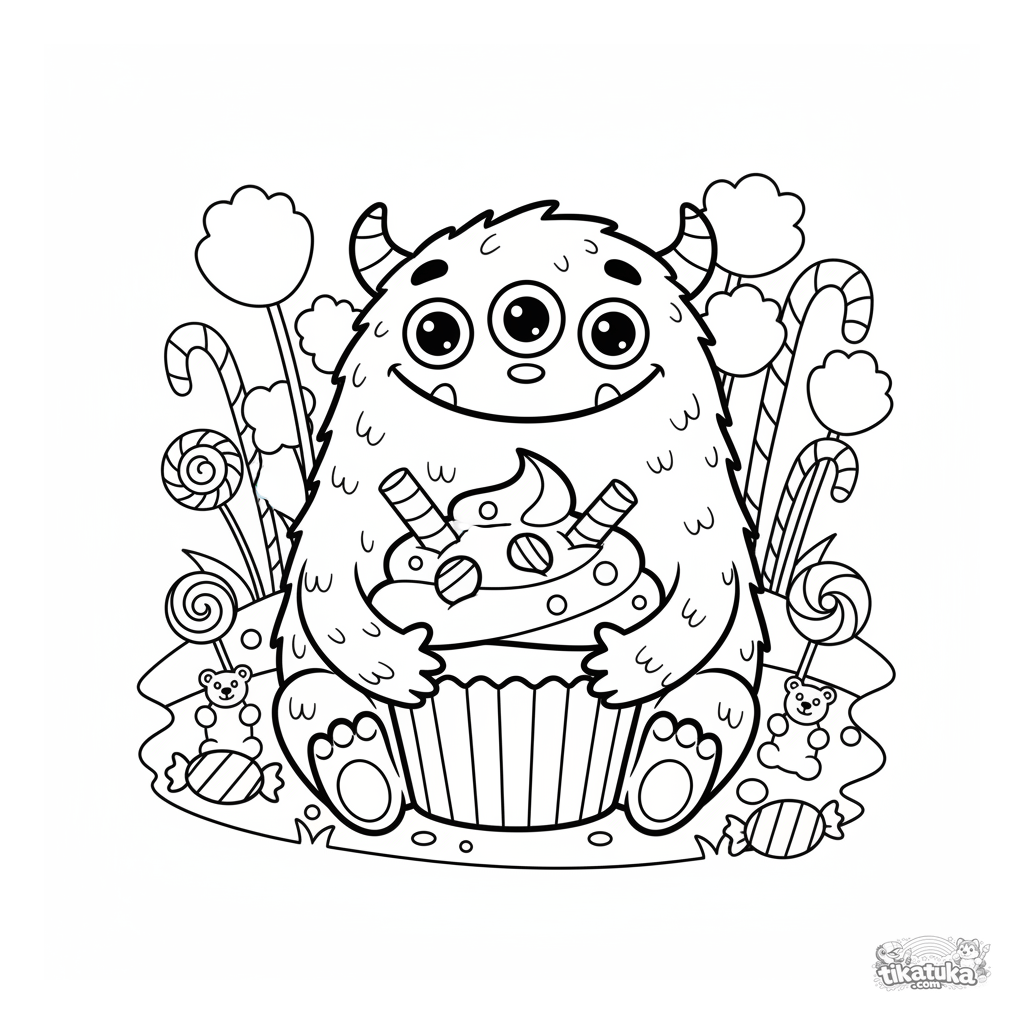 Página para colorear para niños: un monstruo peludo abraza una magdalena gigante. Escena divertida en un prado de dulces, para 4-6 años.