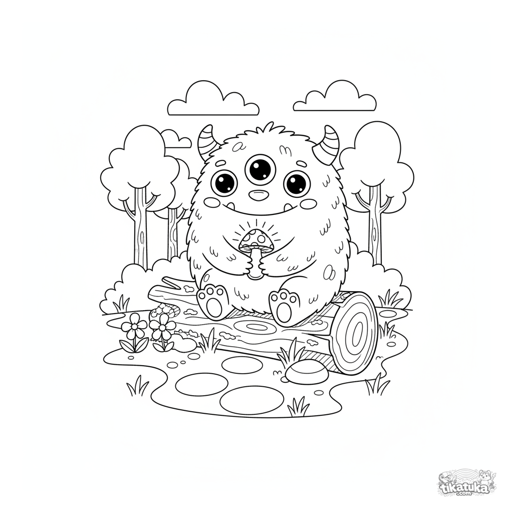 Página para colorear de un monstruo peludo y amigable en un bosque. Para niños de 4 a 6 años. El monstruo de tres ojos se sienta en un tronco sosteniendo un hongo brillante.