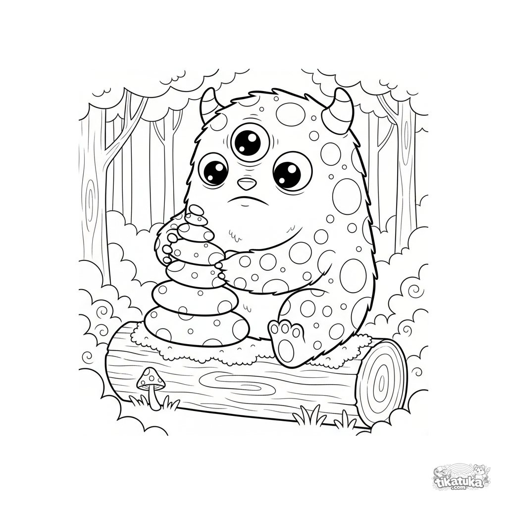 Página para colorear de un monstruo peludo amigable en un bosque. Para niños de 4 a 6 años. El monstruo apila una torre de piedras cerca de un hongo brillante.