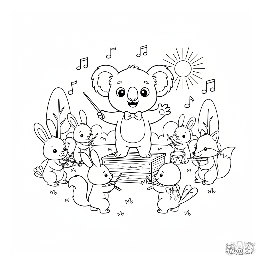 Página para colorear para niños 4-6: un koala director de orquesta dirige una orquesta de animales en un festival. Escena alegre con notas musicales flotantes.