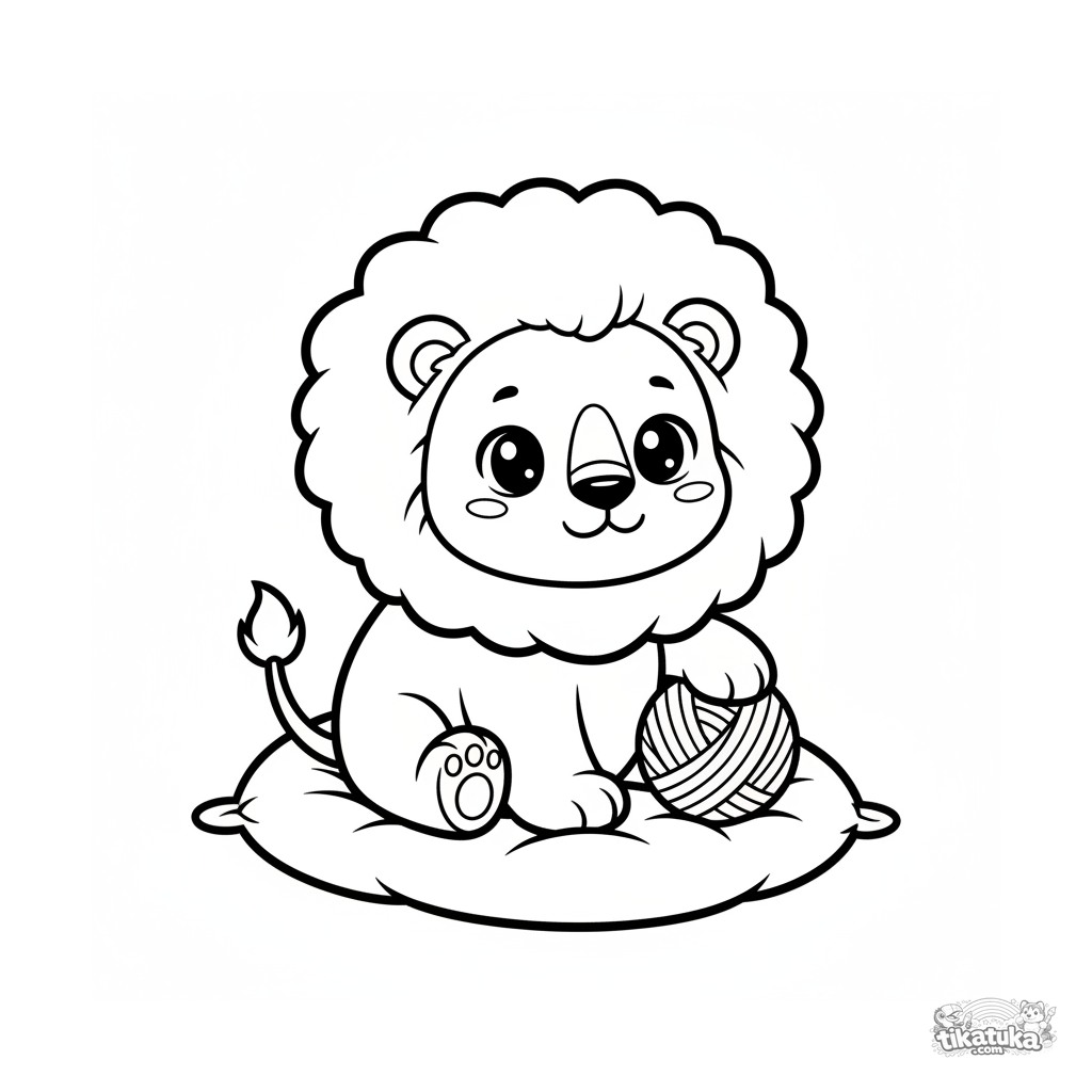 Página para colorear para niños pequeños: un león de peluche amable con melena esponjosa se sienta en un cojín. Grandes áreas cerradas de melena y cuerpo son fáciles de colorear para niños de 2-3 años.