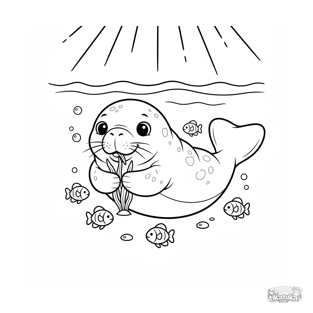 Página para colorear para niños de 4-6 años: Un manatí amigable pasta pasto marino en aguas poco profundas soleadas. Estilo de mascota de peluche.