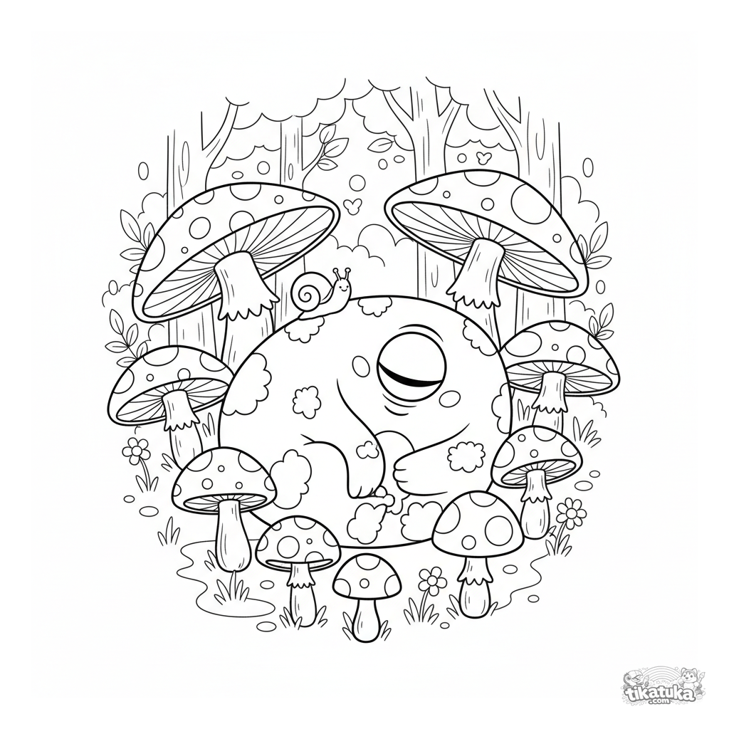Página para colorear de un cíclope amigable y musgoso durmiendo en un anillo mágico de hongos. Para niños de 4 a 6 años.