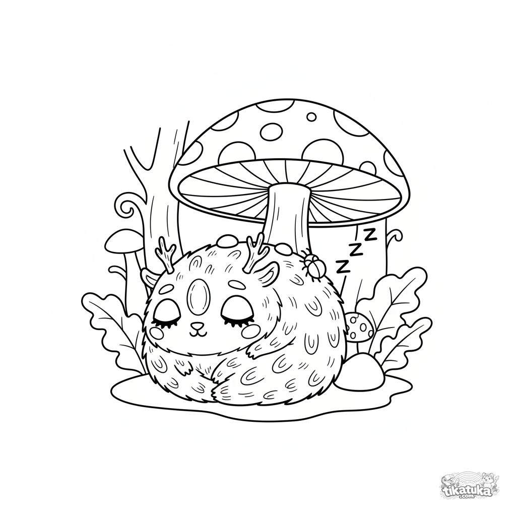 Página para colorear para niños de 4-6 años: un monstruo de musgo lindo y nada aterrador duerme profundamente bajo una gran seta en un bosque mágico. Escena pacífica y amigable.