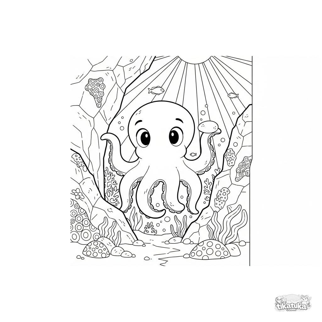 Página para colorear de un pulpo jugando al escondite entre rocas en aguas soleadas poco profundas. Para niños de 4 a 6 años.