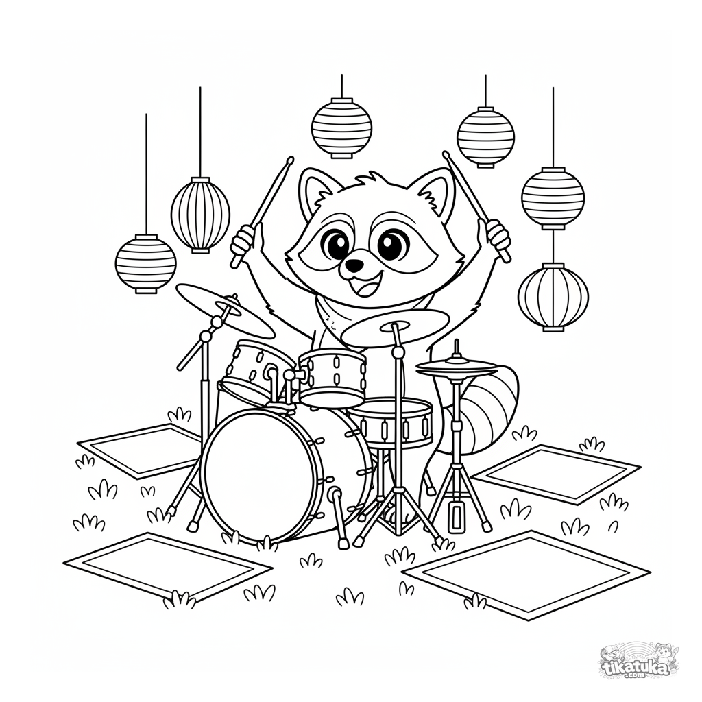 Página para colorear para niños de 4-6 años: un alegre mapache baterista toca la batería en un césped de festival. Formas simples y personaje amigable.