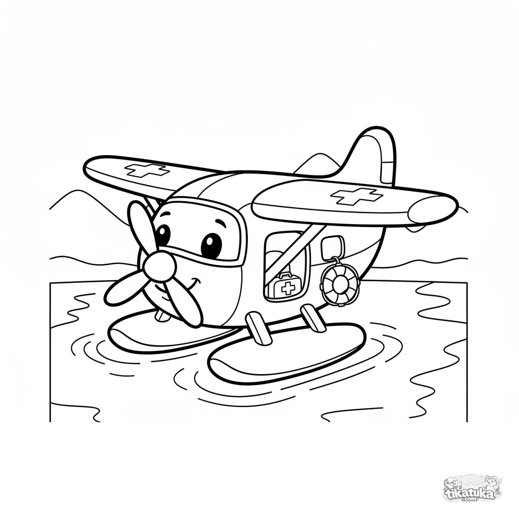 Página simple para colorear de un hidroavión para niños pequeños de 2-3 años. Un avión amigable flota en un lago tranquilo.