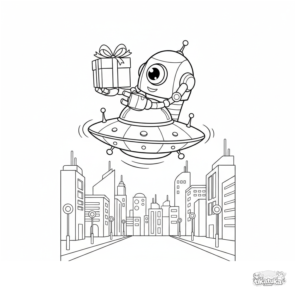 Página para colorear para niños de 4-6 años: un robot repartidor amigable en un platillo volador lleva un paquete sobre una ciudad futurista. Formas claras, escena simple.