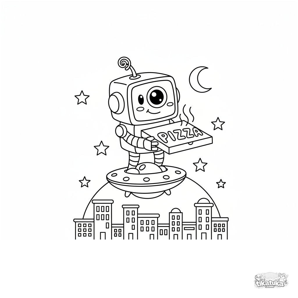 Página para colorear para niños de 4-6 años: un robot repartidor amigable se balancea en un platillo volador llevando una pizza sobre la ciudad.