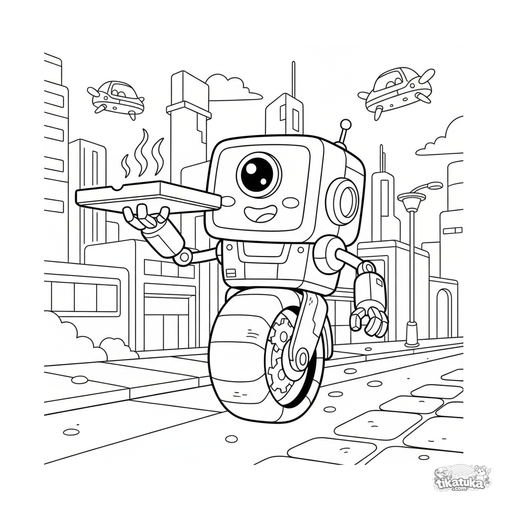 Página para colorear para niños: un robot repartidor amigable en una monorrueda lleva pizza por una ciudad futurista. Para niños de 4 a 6 años.