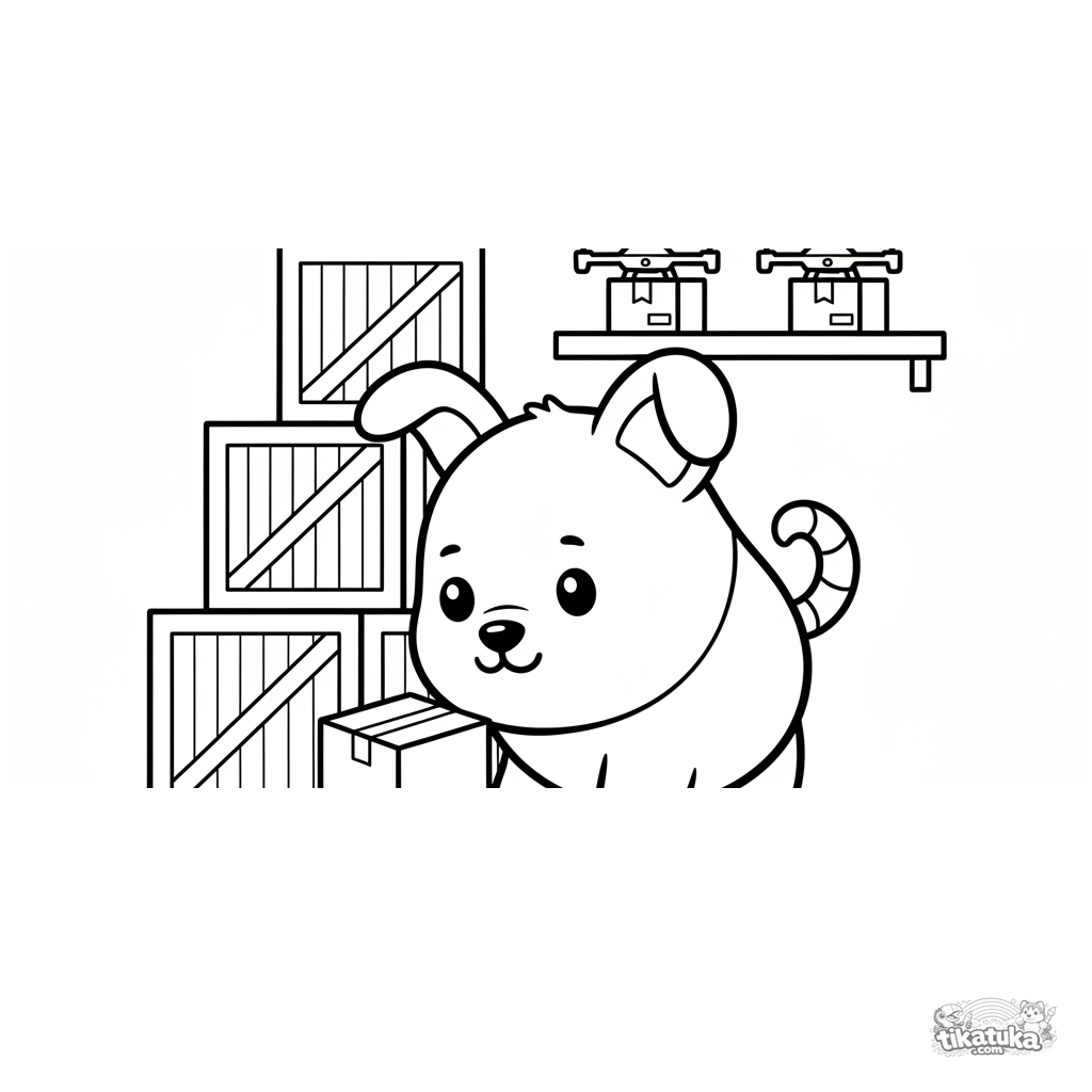 Página para colorear para niños pequeños: un lindo perro robot juega con una caja en un gran almacén entre estantes y drones. Formas simples y márgenes amplios.