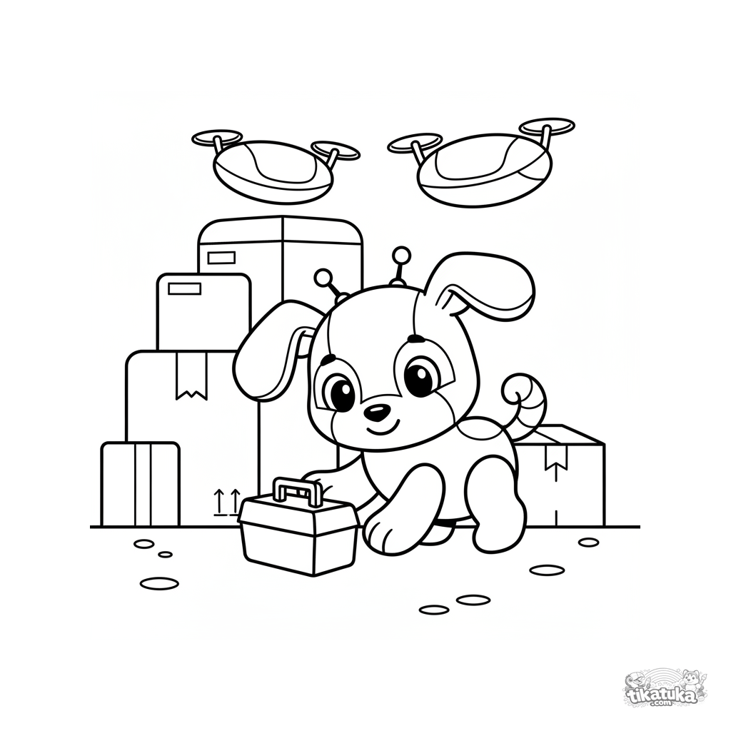 Página para colorear para niños pequeños: un lindo perro robot juega con una caja de herramientas en un almacén entre cajas y drones voladores.
