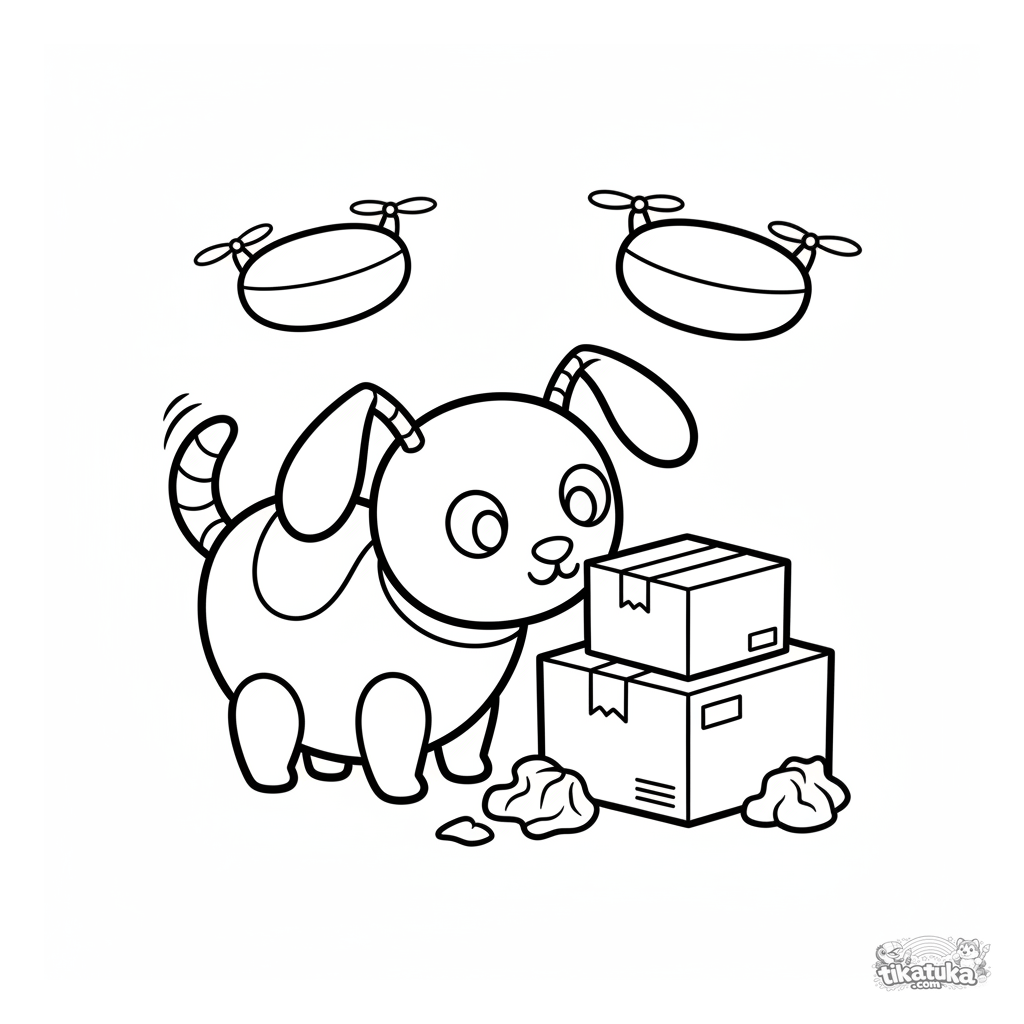 Página para colorear para niños pequeños: un perro robot amigable explora un almacén entre cajas y drones voladores. Formas simples y márgenes amplios.