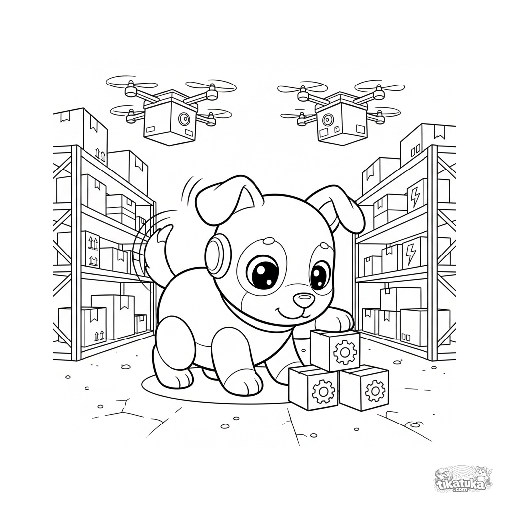 Página para colorear para niños 4-6: un perro robot amigable ordenando cajas en un almacén entre drones. Formas simples y personaje alegre.