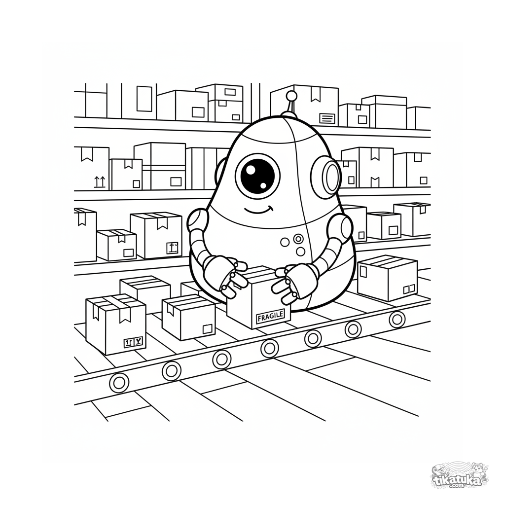 Página para colorear para niños 4-6: un robot ayudante amigable con forma de pera clasifica cajas en una cinta transportadora en un pasillo de almacén concurrido. Formas claras, detalle moderado.