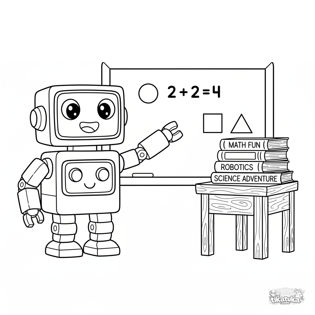 Página para colorear para niños 4-6: un robot profesor amigable explica matemáticas en la pizarra de la escuela. Formas simples, escena clara.