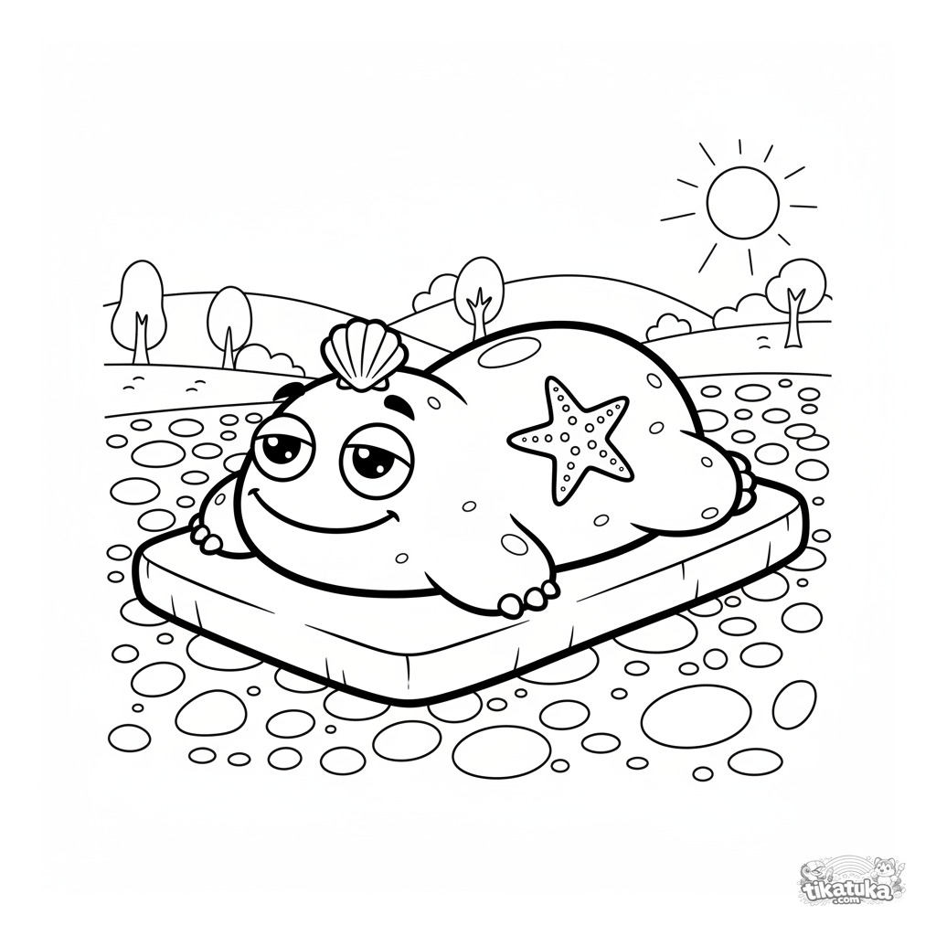 Página para colorear de un monstruo de roca amigable tomando el sol en una playa de guijarros. Para niños de 5 a 8 años.