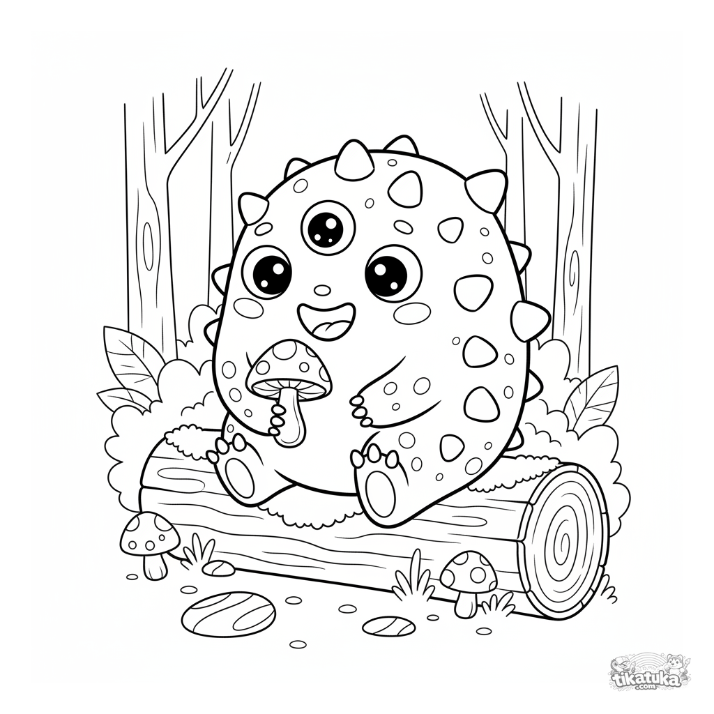 Página para colorear de un monstruo espinoso amigable con tres ojos en el bosque. Para niños de 4 a 6 años. El monstruo se sienta en un tronco sosteniendo un hongo brillante.