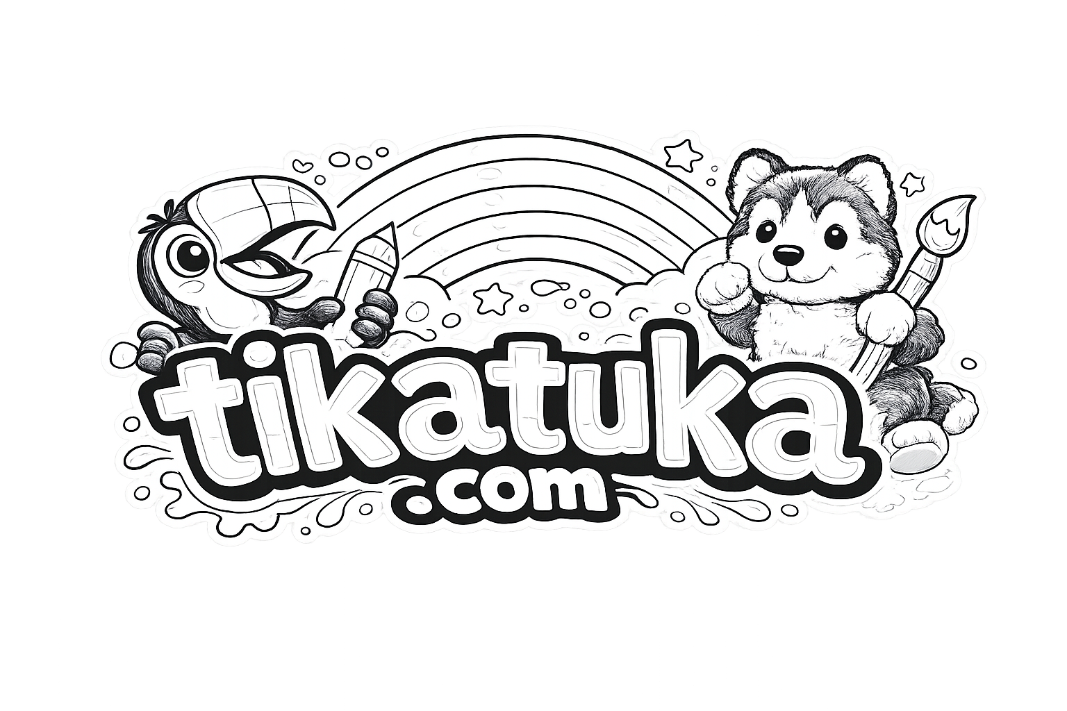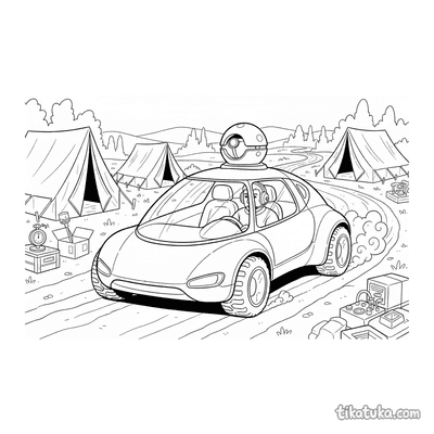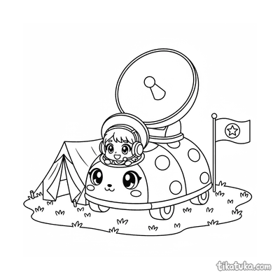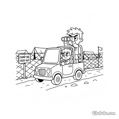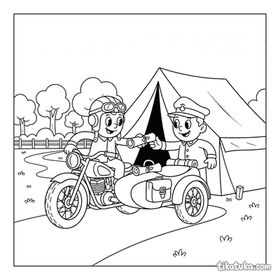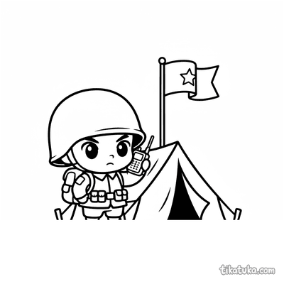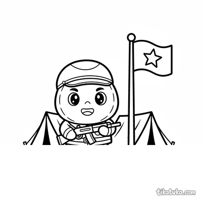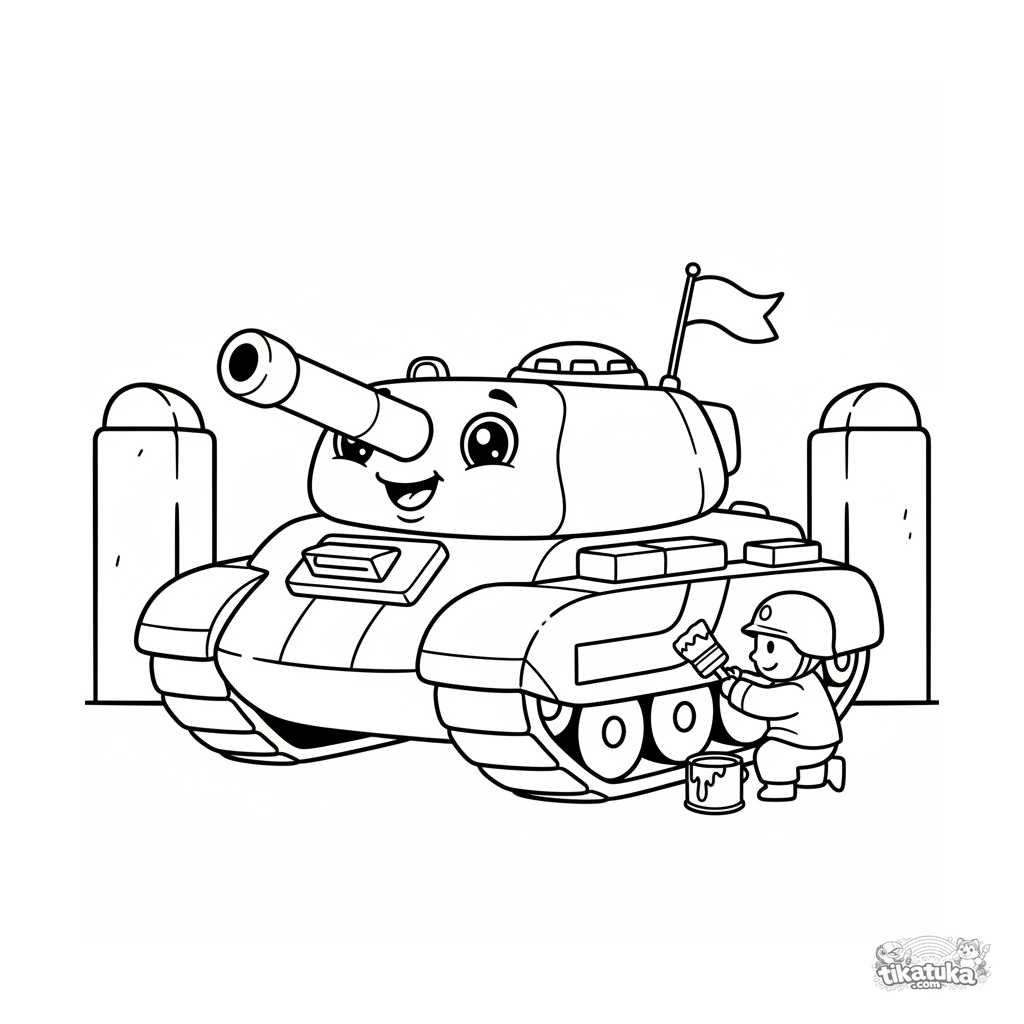 Página para colorear muy simple para bebés 2-3: un tanque amigable custodia la entrada a un campamento de campaña. Formas grandes, detalles mínimos, márgenes amplios.