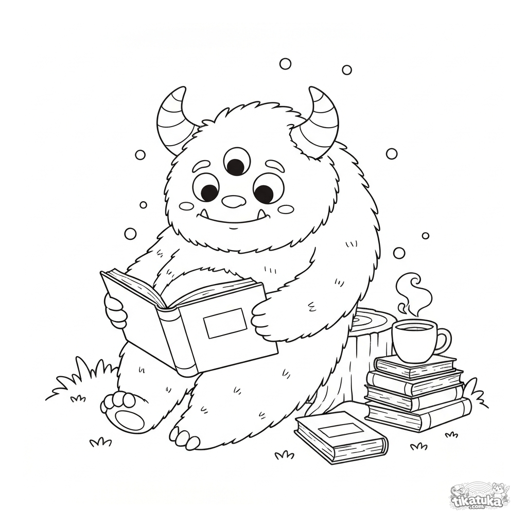Página para colorear con un monstruo amigable. Monstruo peludo de tres ojos lee un libro junto a un tocón. Para niños de 5 a 8 años, escena linda.