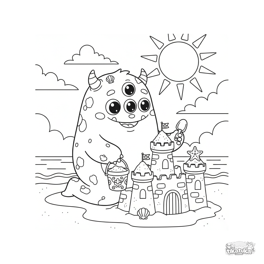 Divertida página para colorear para niños de 4-6 años: un monstruo amigable de tres ojos construye un castillo de arena en la playa. Escena brillante y positiva con detalles claros.