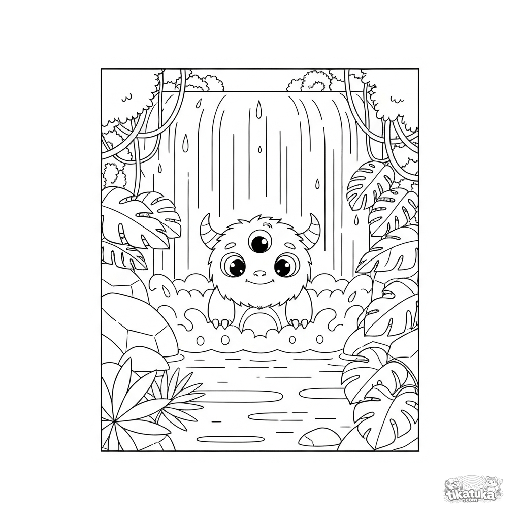 Página para colorear de un monstruo amigable de tres ojos asomándose tras una cascada en la jungla. Para niños de 6-9 años. Escena detallada con enredaderas, rocas y plantas.