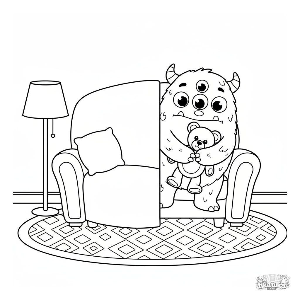 Linda página para colorear de un monstruo peludo de tres ojos escondido detrás de un sofá con un oso de peluche. Para niños de 3-6 años.