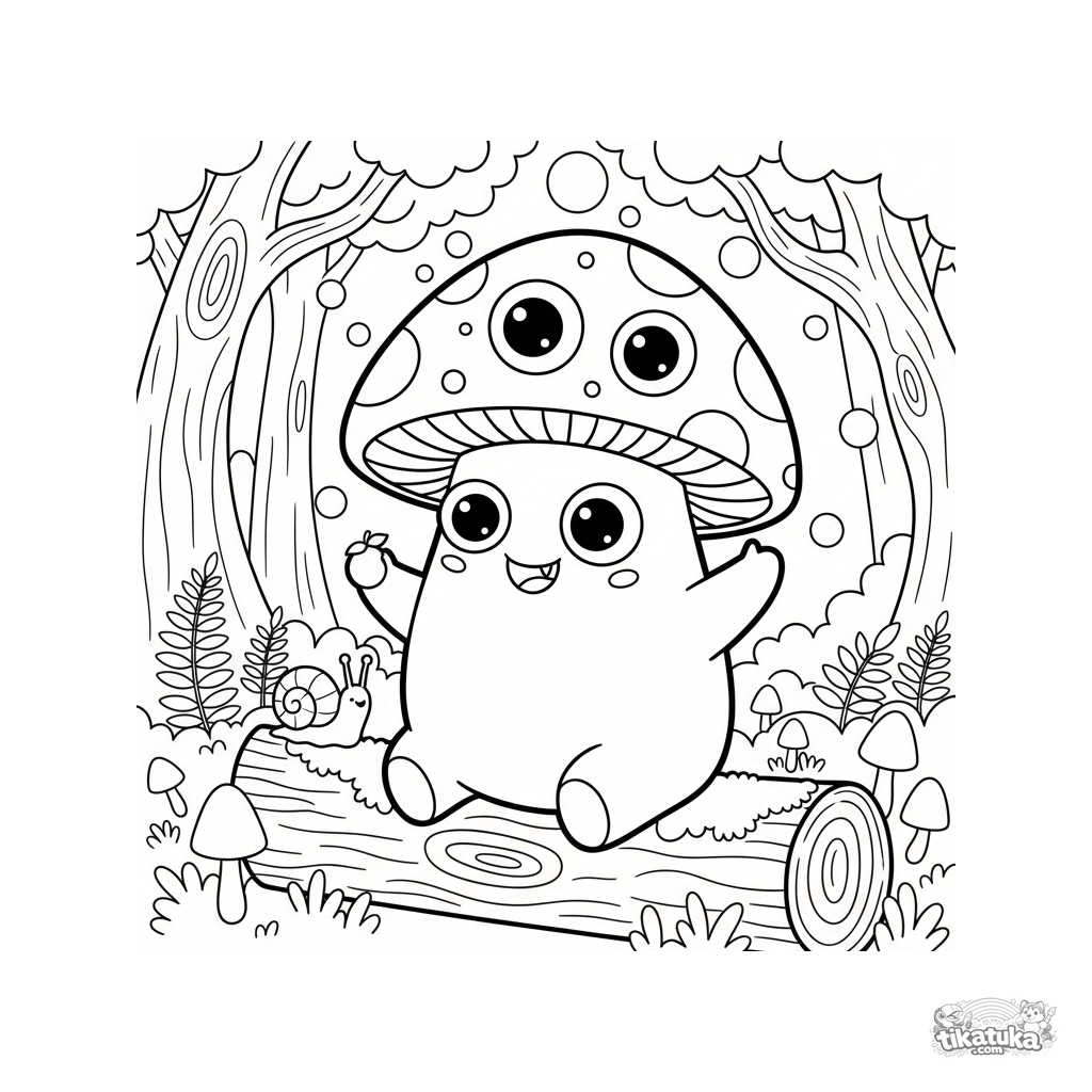 Página para colorear de un monstruo hongo de tres ojos amigable en un bosque encantado. Para niños de 4 a 6 años. Escena simple con contornos claros.