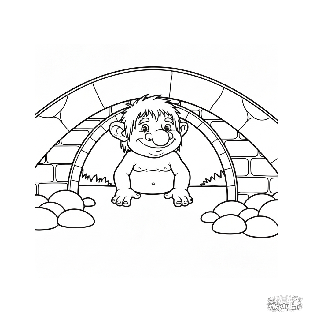 Página para colorear de un troll amistoso asomándose con curiosidad bajo un puente de piedra. Escena simple para niños de 3 a 5 años.