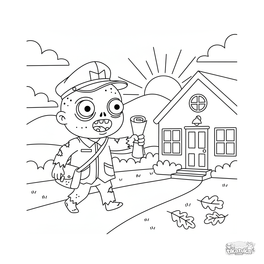 Página para colorear de un zombi cartero amigable repartiendo periódicos al amanecer. Para niños de 4 a 6 años. Una escena de dibujos animados divertida y no aterradora.
