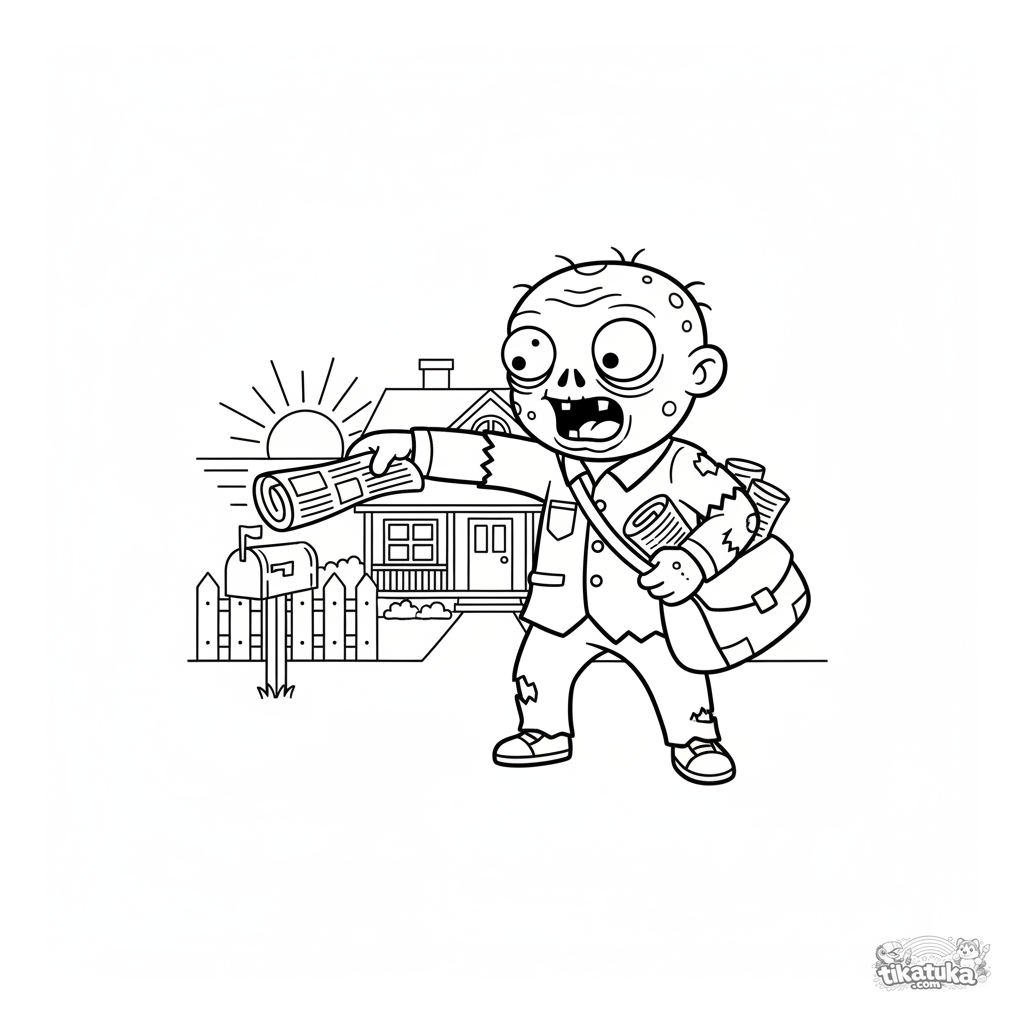 Página divertida para colorear para niños de 4 a 6 años: un zombi cartero amigable reparte periódicos en una calle tranquila. Estilo de dibujos animados, no da miedo.